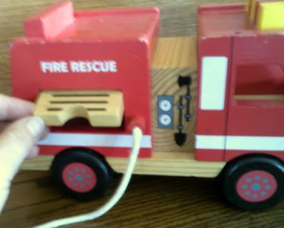 Wooden Firetruck toy.  Back opens up; side panel opens so you can pull out Water Hose to put out the fire; wheels work.  Cute Firetruck